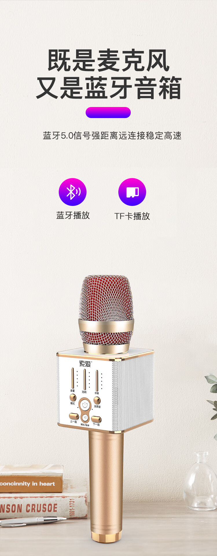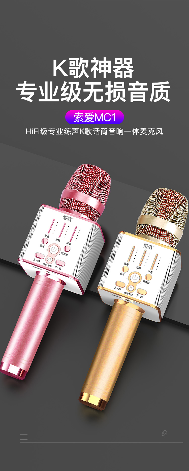 索爱(soaiy)MC1 全民k歌手机麦克风话筒 唱吧录音主播声卡套装唱歌神器音响一体无线蓝牙家庭ktv 香槟金